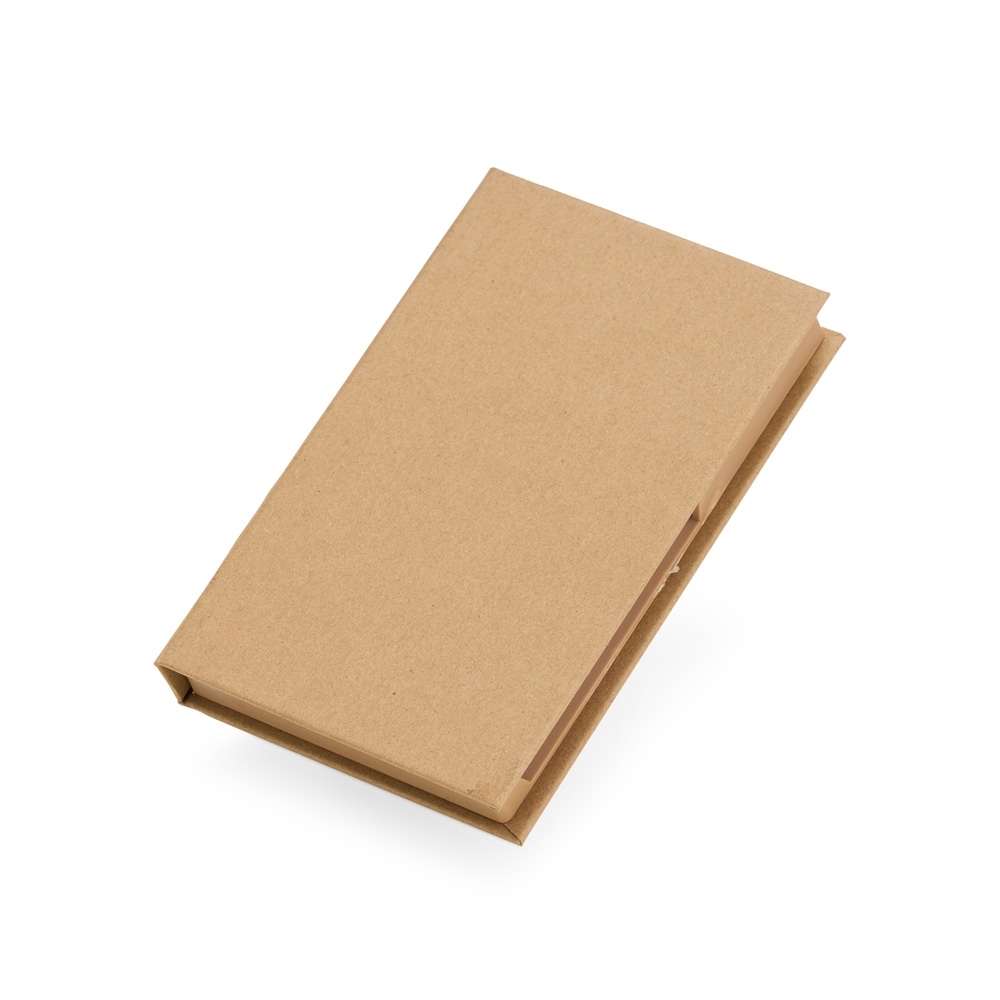 Bloco de Anotações Ecológico personalizado com sua logo, é perfeito para manter a organização enquanto se registra ideias. Feito de material kraft, ele vem com 100 folhas brancas para anotações, 5 marcadores autoadesivos coloridos para destacar o que é importante, 7 clips guardados em uma gavetinha prática e uma mini caneta de papelão com carga esferográfica azul. E ainda conta com espaço para armazenar a caneta e dois suportes porta-caneta, garantindo praticidade no dia a dia.