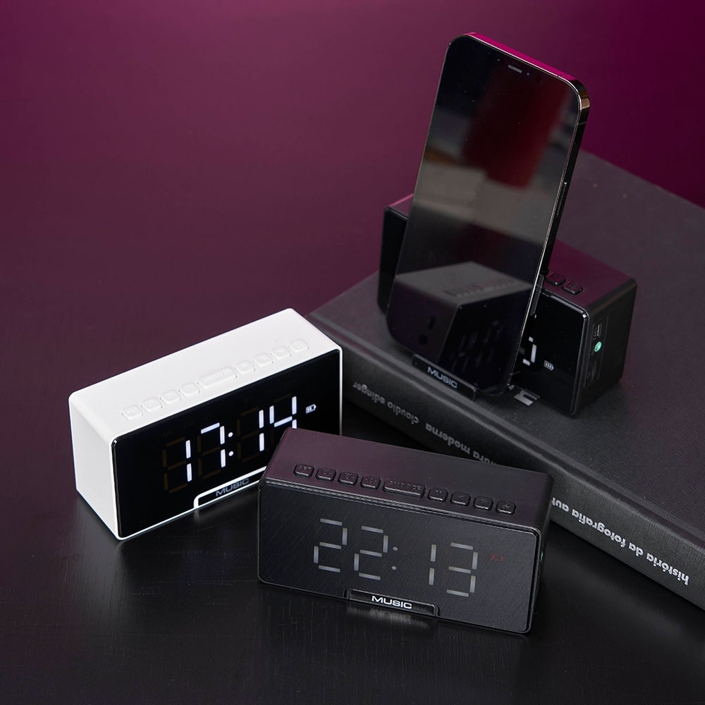 Caixa de som multimídia com estrutura em plástico e metal, suporte retrátil para celular, display em LED e painel de botões para controlar o aparelho. Possui conexão Bluetooth 5.0 e entradas para cabo auxiliar P2 e cartão TF (microSD), permitindo a reprodução de arquivos MP3. Acompanha cabo Micro USB para a recarga do dispositivo.