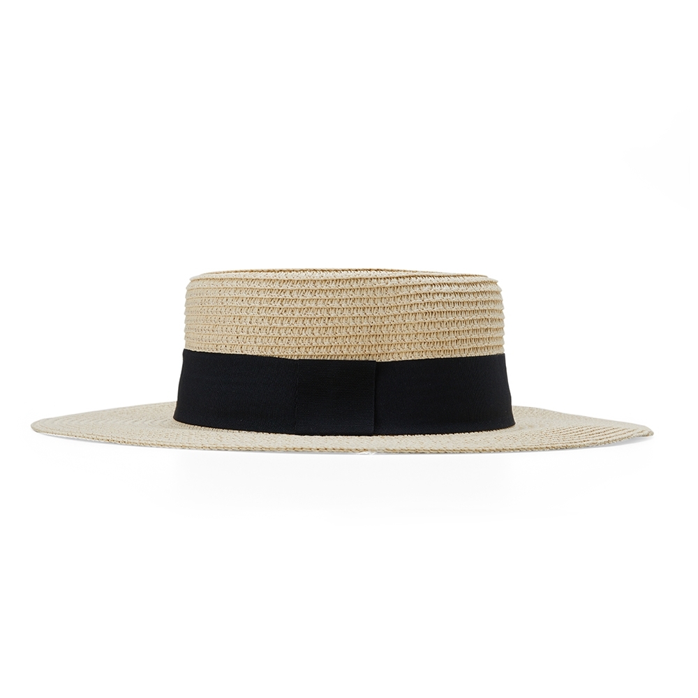 Chapéu de palha com aba levemente ondulada e faixa de poliéster fixa, feito em tamanho único com ajuste interno.