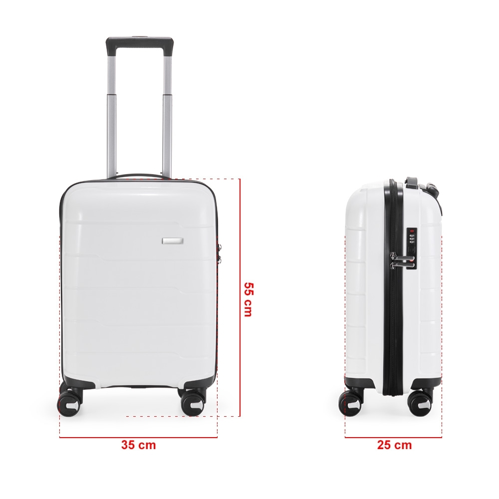 Mala de bordo 45 litros em plástico PP (casca dura), contém cadeado numérico TSA. Compartimentos com bolso telado e cinta compressora para roupas. A mala possui duas alças de mão, puxador retrátil com regulagem de tamanho, quatro rodinhas 360º e apoios laterais.