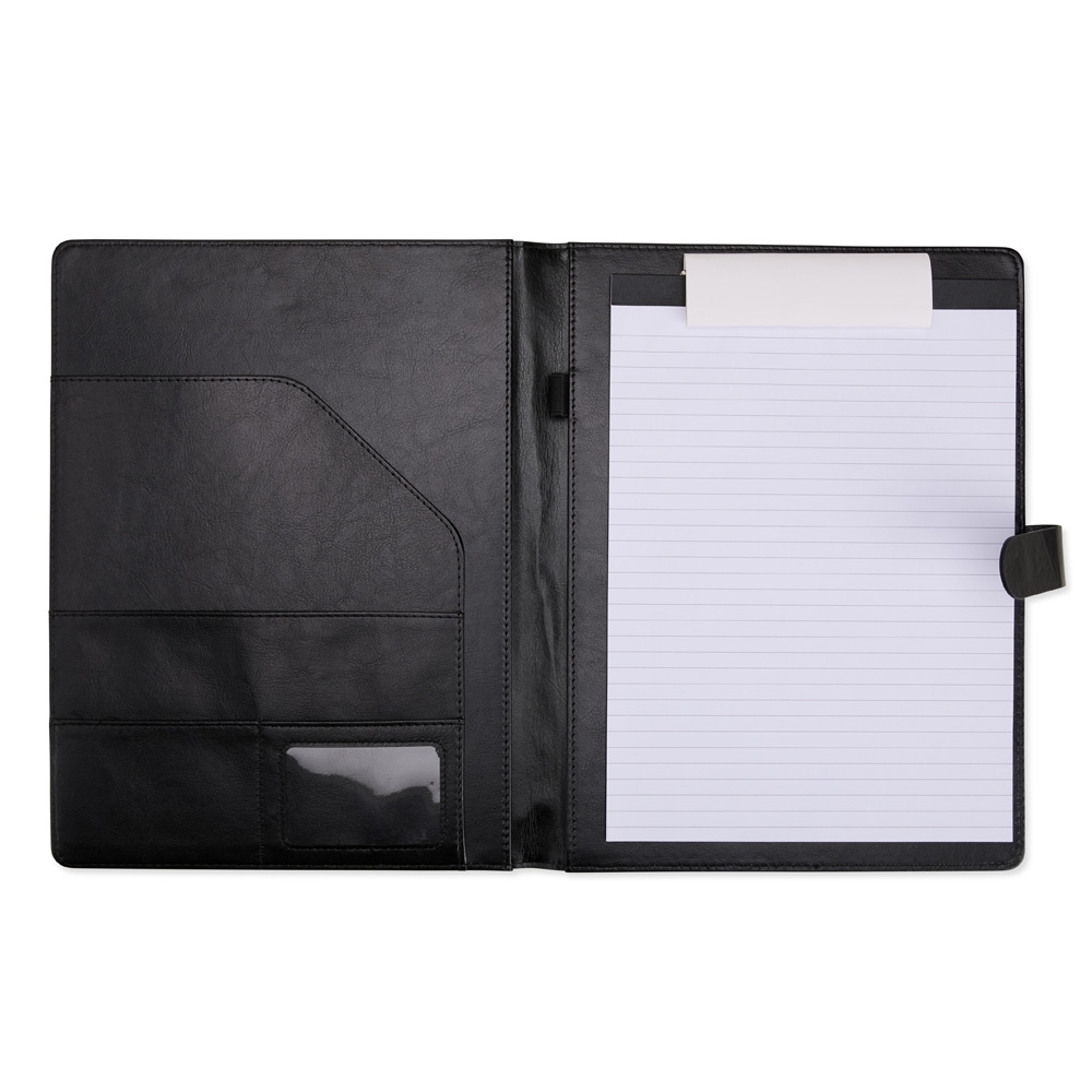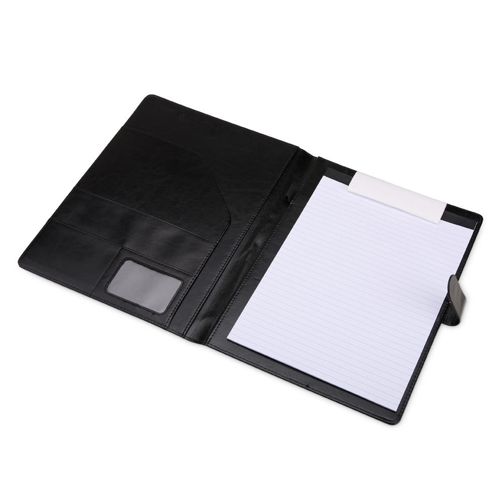 Pasta executiva personalizada, feita em couro sintético de alta qualidade, acompanha um bloco de aproximadamente 20 folhas pautadas removíveis para anotações, suporte para caneta, bolsos para organizar folhas ou documentos, suporte para cartões, incluindo um com visor de identificação. Além disso, possui fechamento magnético, unindo praticidade e elegância em um único produto.