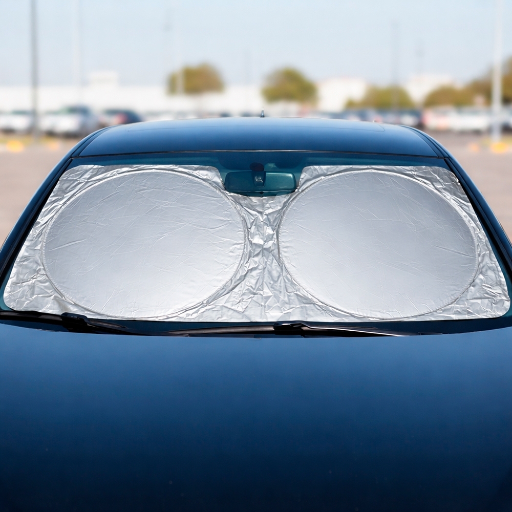 Protetor solar dobrável para para-brisa, confeccionado em tecido leve e com estrutura flexível. Possui alça lateral elástica para facilitar o manuseio.